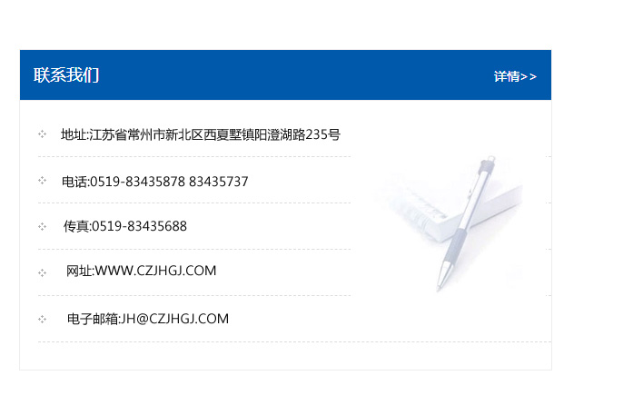 地址:常州市新北區友邦商務大廈1幢16、17層  電話:0519-85101652  傳真:0519-85112595  郵編:213022  網址:www.cz-jiayue_cn.ybjjl.com  郵箱:xiajifengaa@163.com